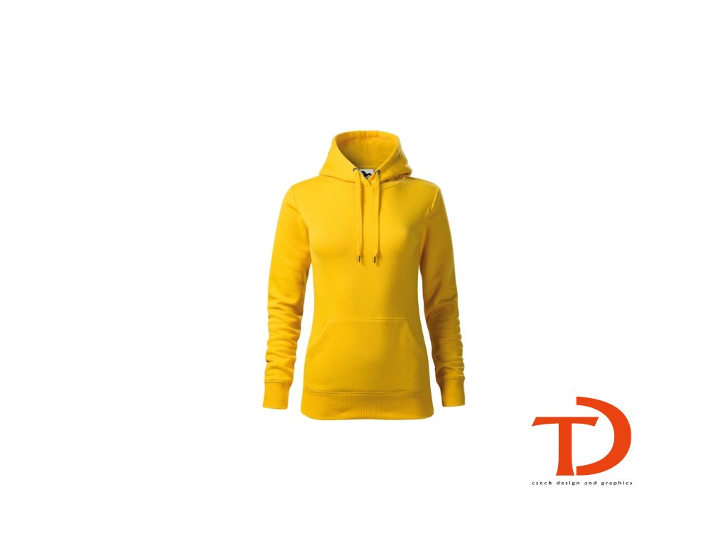 lehce vypasovaný střih s bočními švy, kapuce s podšívkou, na stažení šňůrkou, vnitřní část průkrčníku začištěna páskou v barvě vrchového materiálu, nakládaná kapsa ve stylu klokanky, dolní lem a manžety rukávů z žebrového úpletu 2:2 s 5 % elastanu, vnitřní strana počesaná