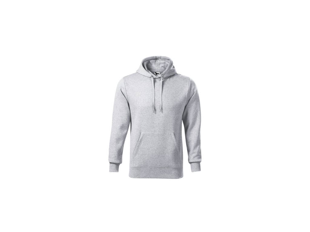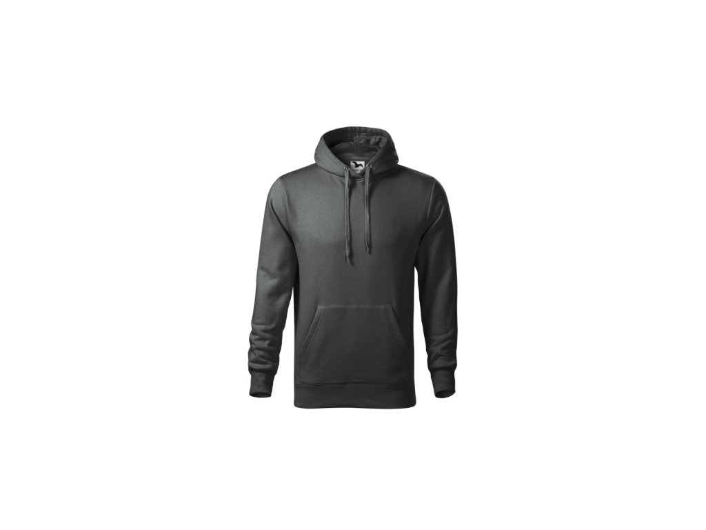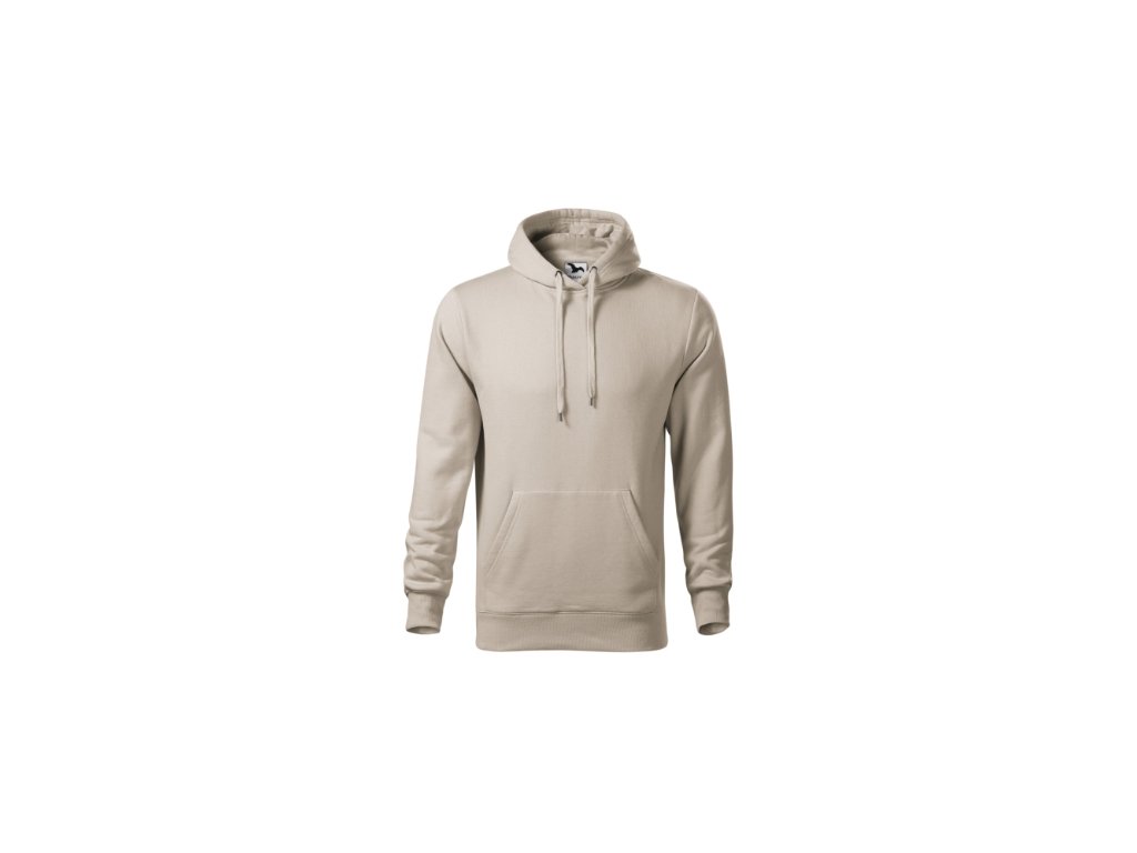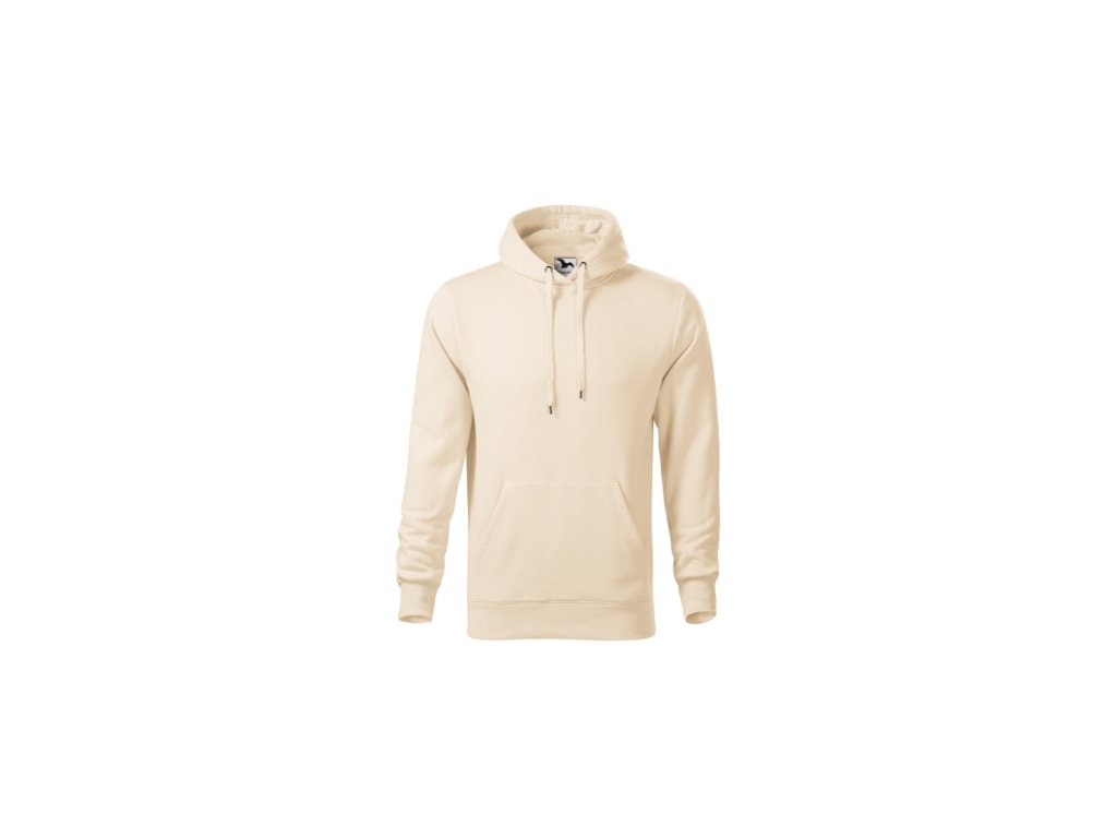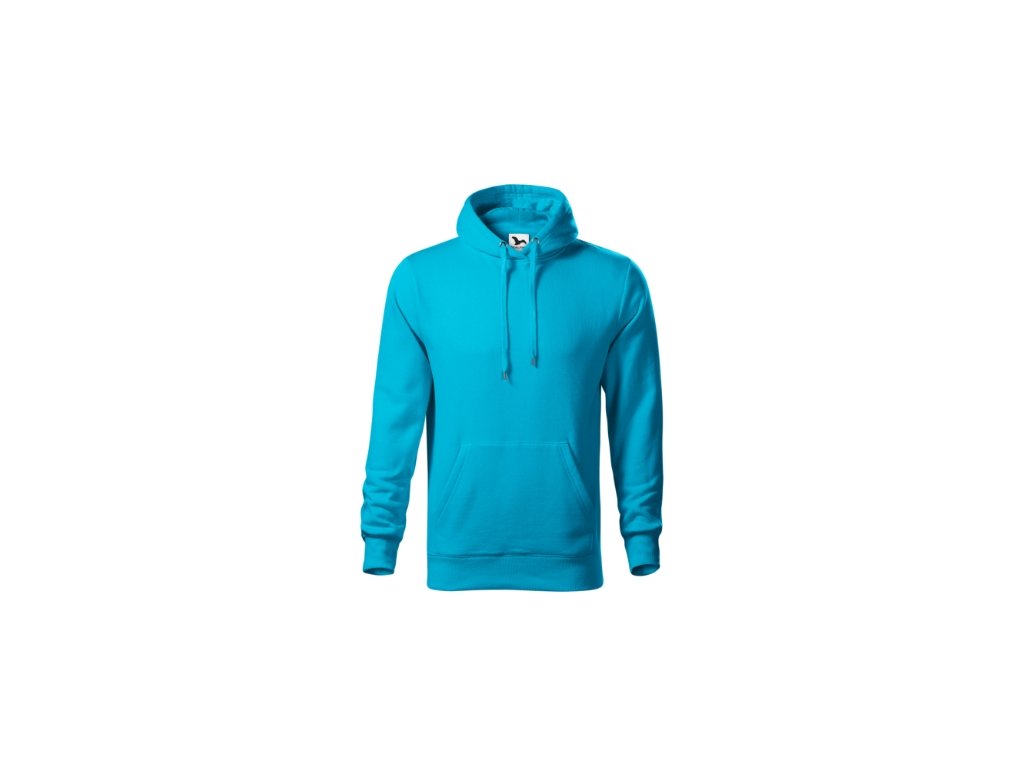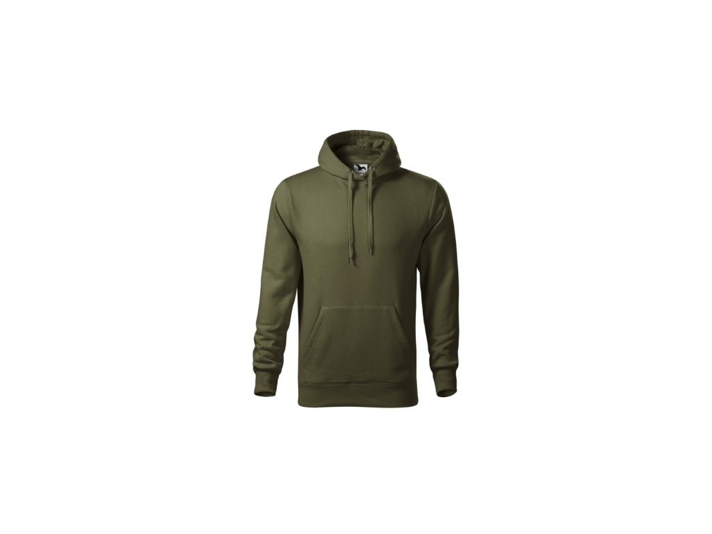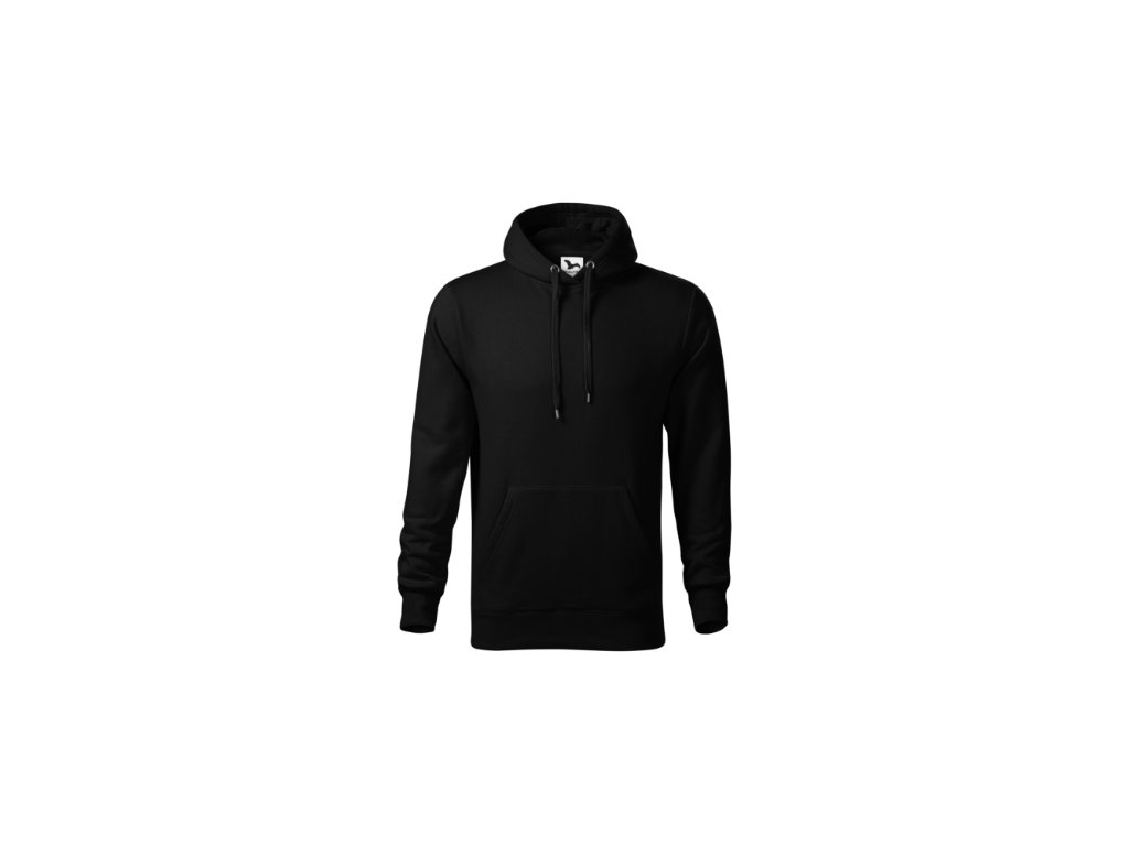 rovný střih s bočními švy, kapuce s podšívkou, na stažení šňůrkou, vnitřní část průkrčníku začištěna páskou v barvě vrchového materiálu, nakládaná kapsa ve stylu klokanky, dolní lem a manžety rukávů z žebrového úpletu 2:2 s 5 % elastanu, vnitřní strana počesaná