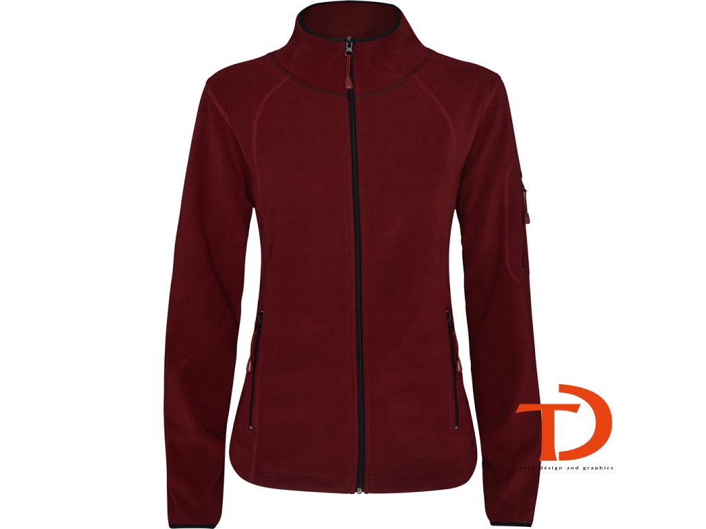 Dámská mikrofleecová sportovní bunda s vysokým límcem, dlouhým rukávem s lemováním v kontrastní barvě. Celolpropínací zip. Boční kapsa a kapsa na levém rukávu na zip. Prošívání na bočních stranách a na hrudi. Nášivka na lokti ze stejného materiálu.Doplňkové parametry