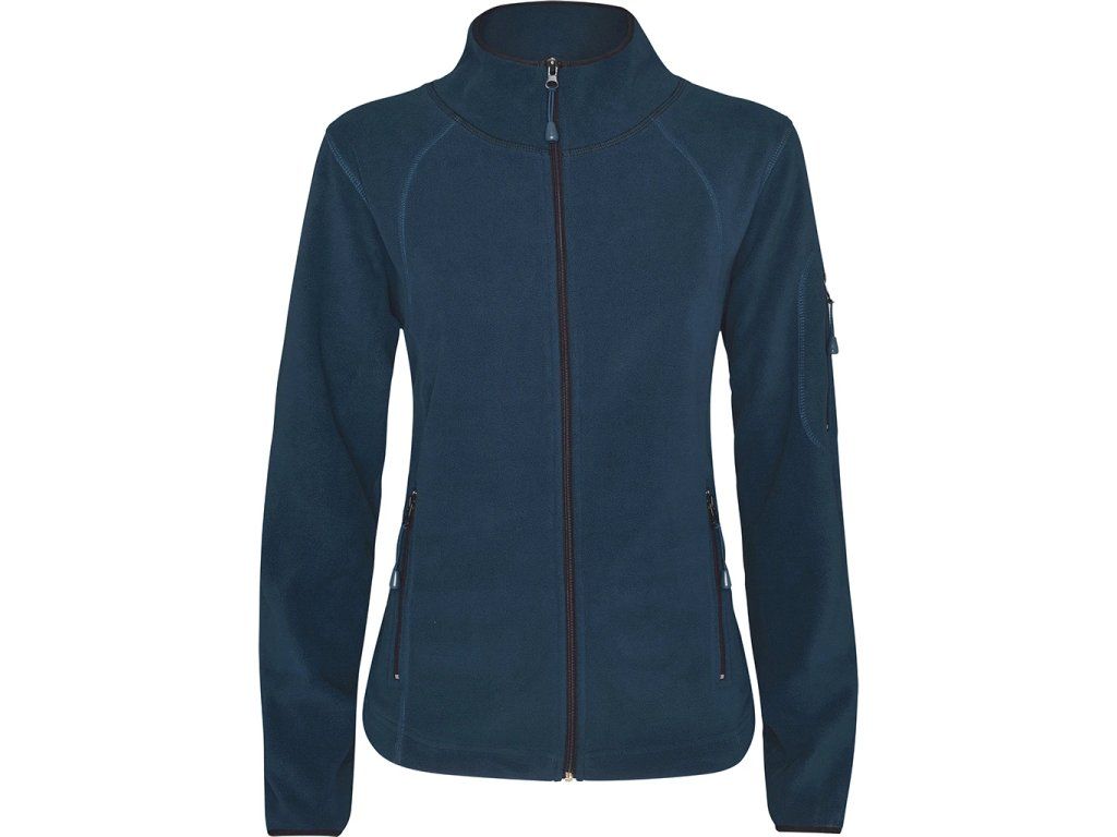 Dámská mikrofleecová sportovní bunda s vysokým límcem, dlouhým rukávem s lemováním v kontrastní barvě. Celolpropínací zip. Boční kapsa a kapsa na levém rukávu na zip. Prošívání na bočních stranách a na hrudi. Nášivka na lokti ze stejného materiálu.Doplňkové parametry