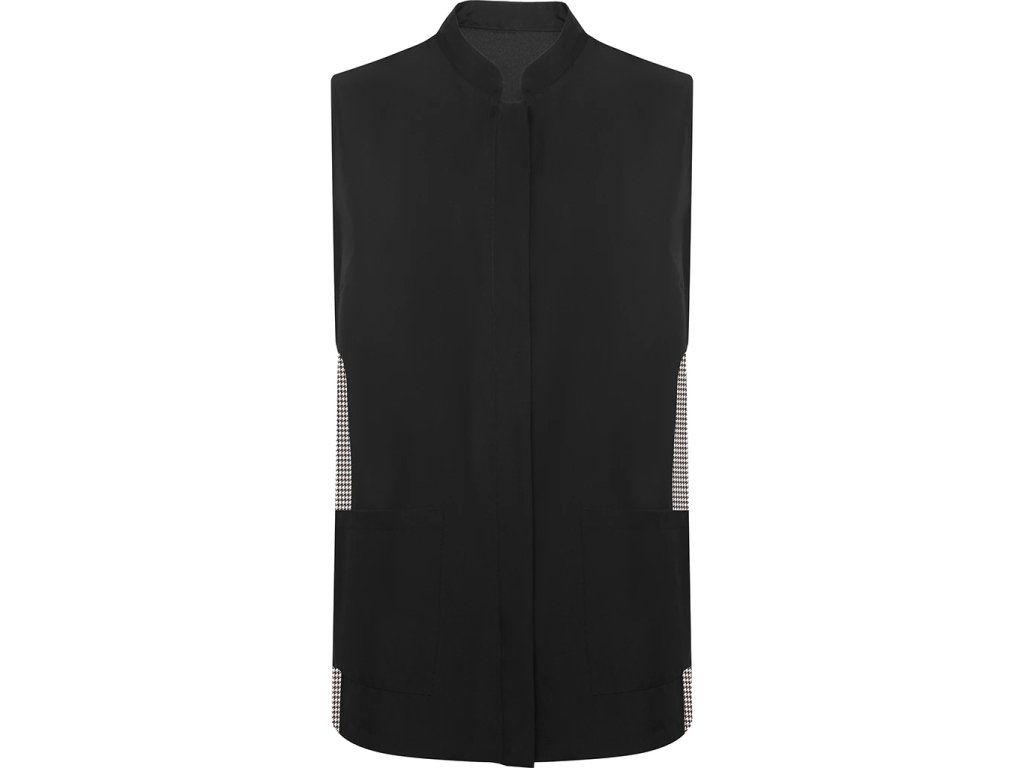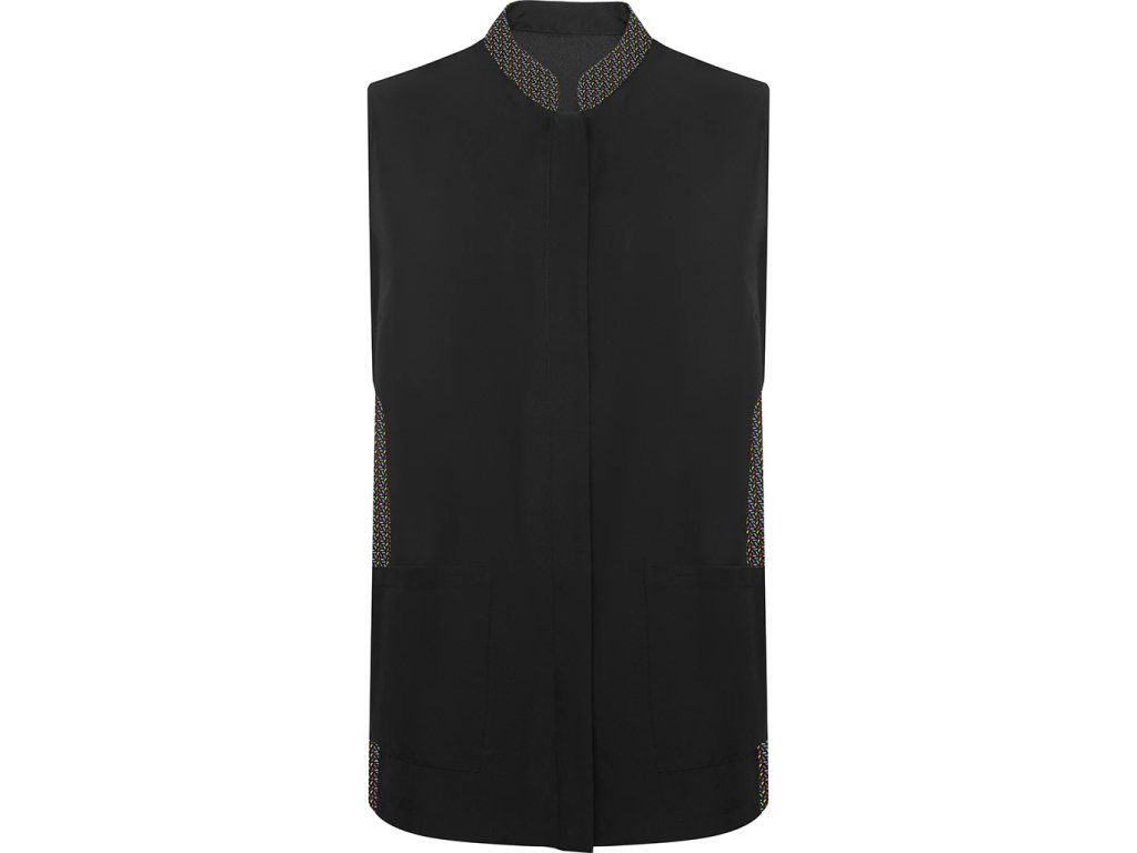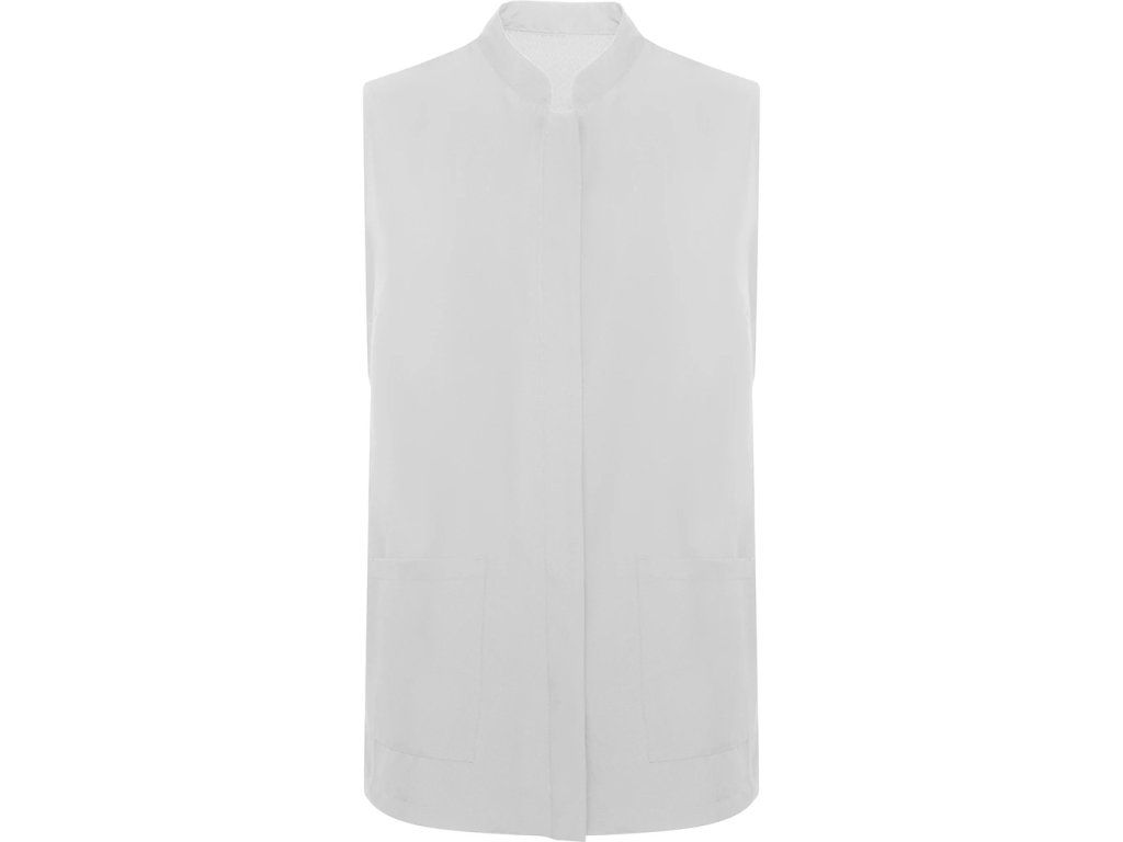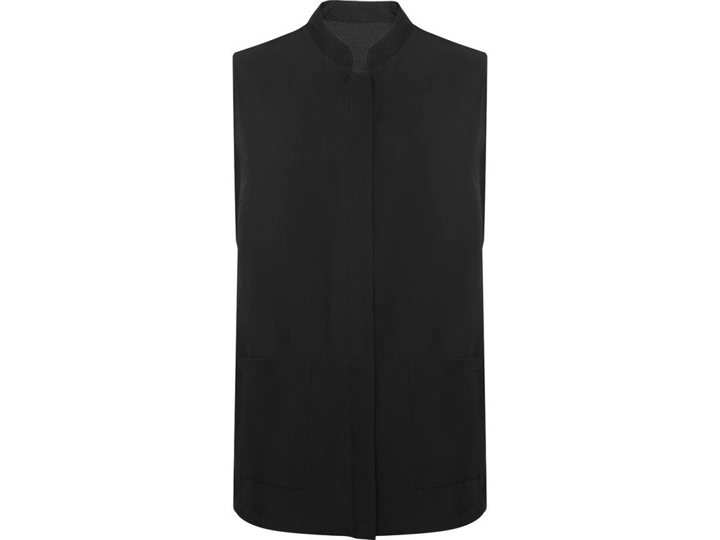 Dámská pracovní halena bez rukávů. Halena má přední skryté zapínání na druky, mandarínový límec, boční panely a záhyby na hrudi a dvě přední kapsy.
