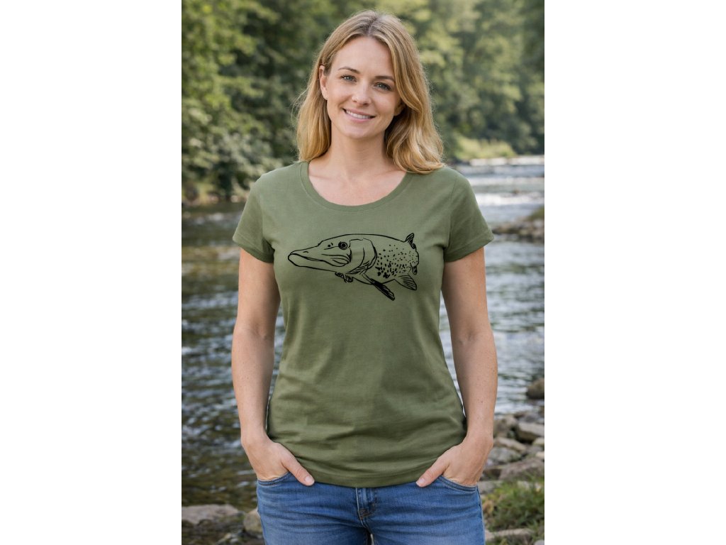 Dámské rybářské tričko s velkou štikou na prsou