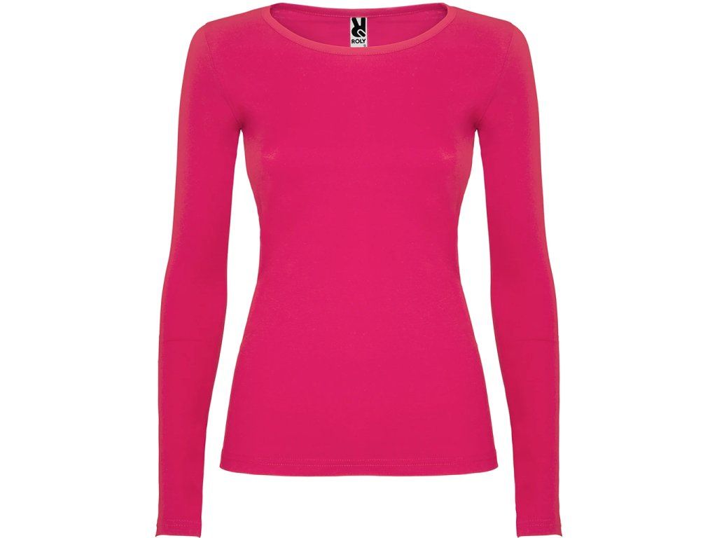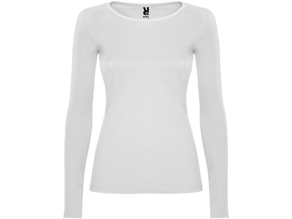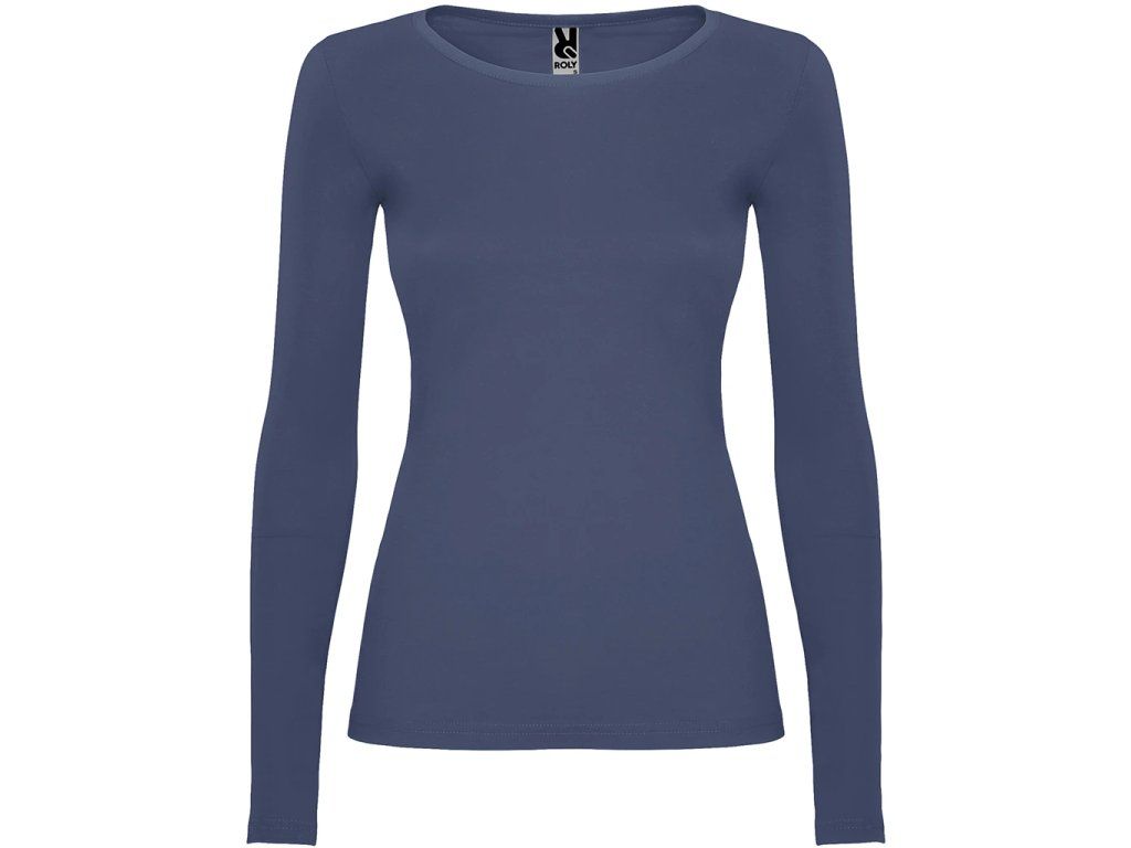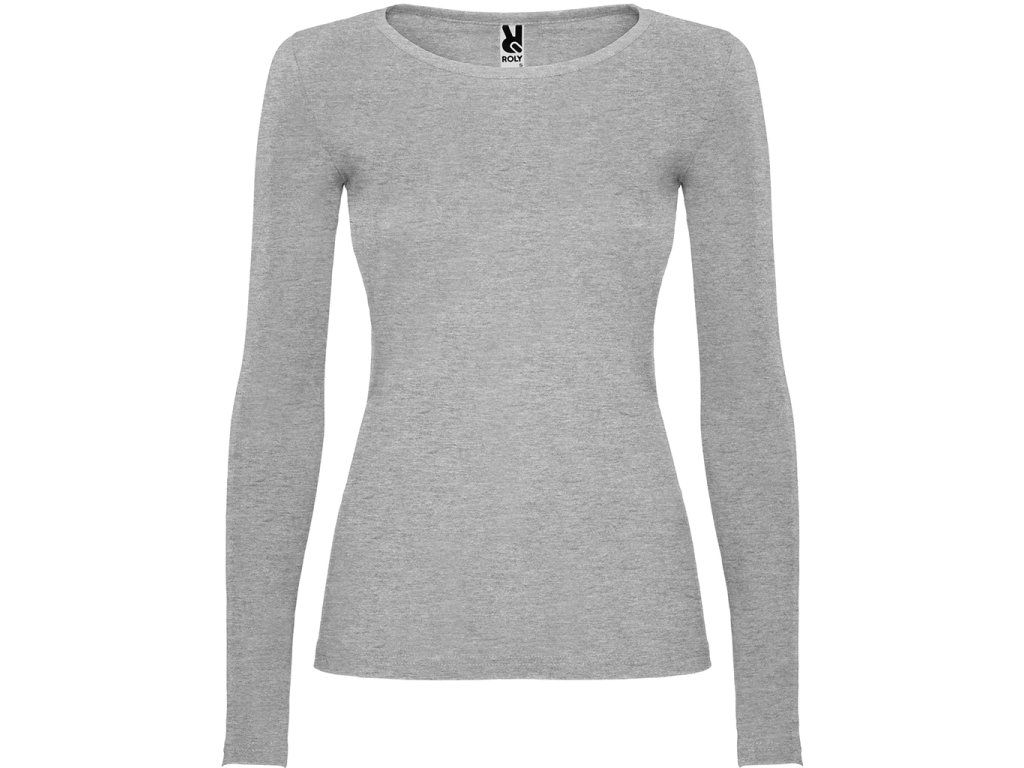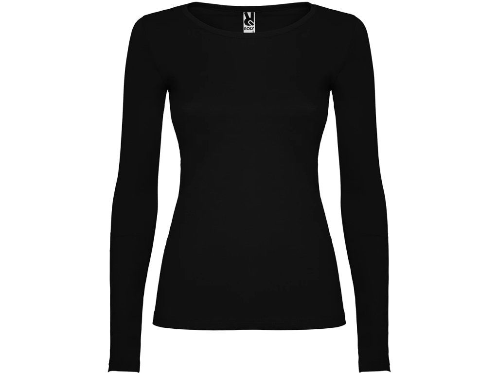 Polopřiléhavé dámské triko s dlouhým rukávem a kulatým výstřihem zakončeným jemným lemem. Rukávy bez manžet, boční švy.