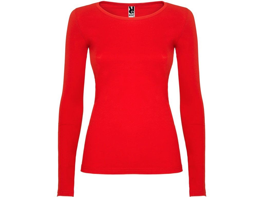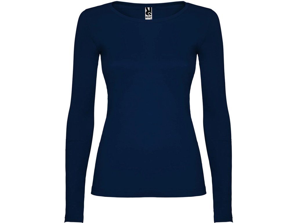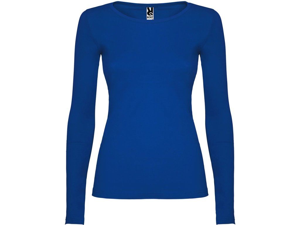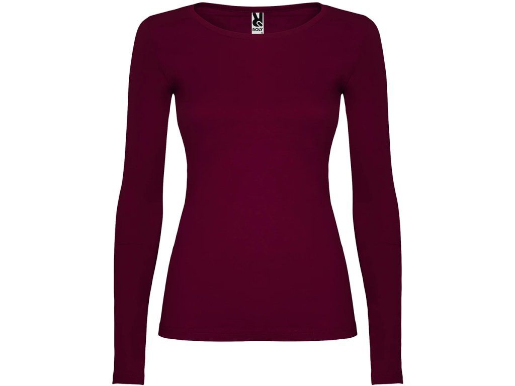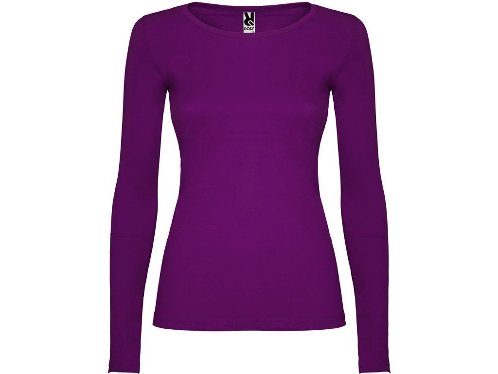 Polopřiléhavé dámské triko s dlouhým rukávem a kulatým výstřihem zakončeným jemným lemem. Rukávy bez manžet, boční švy.