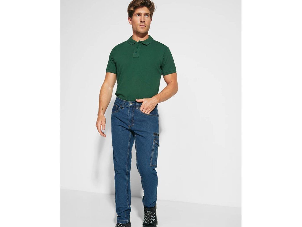 Džínové kalhoty se zapínáním na kovový zip a knoflík. Pas s poutky na opasek. Kalhoty mají levou boční skládanou kapsi s klopou a zapínáním na suchý zip, levou boční kapsu na zip a dvojitou úzkou pravou kapsu. Kontrastní švy.Doplňkové parametry
