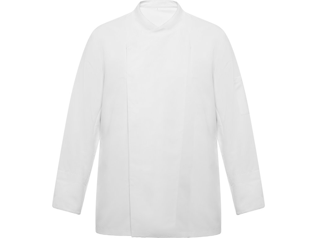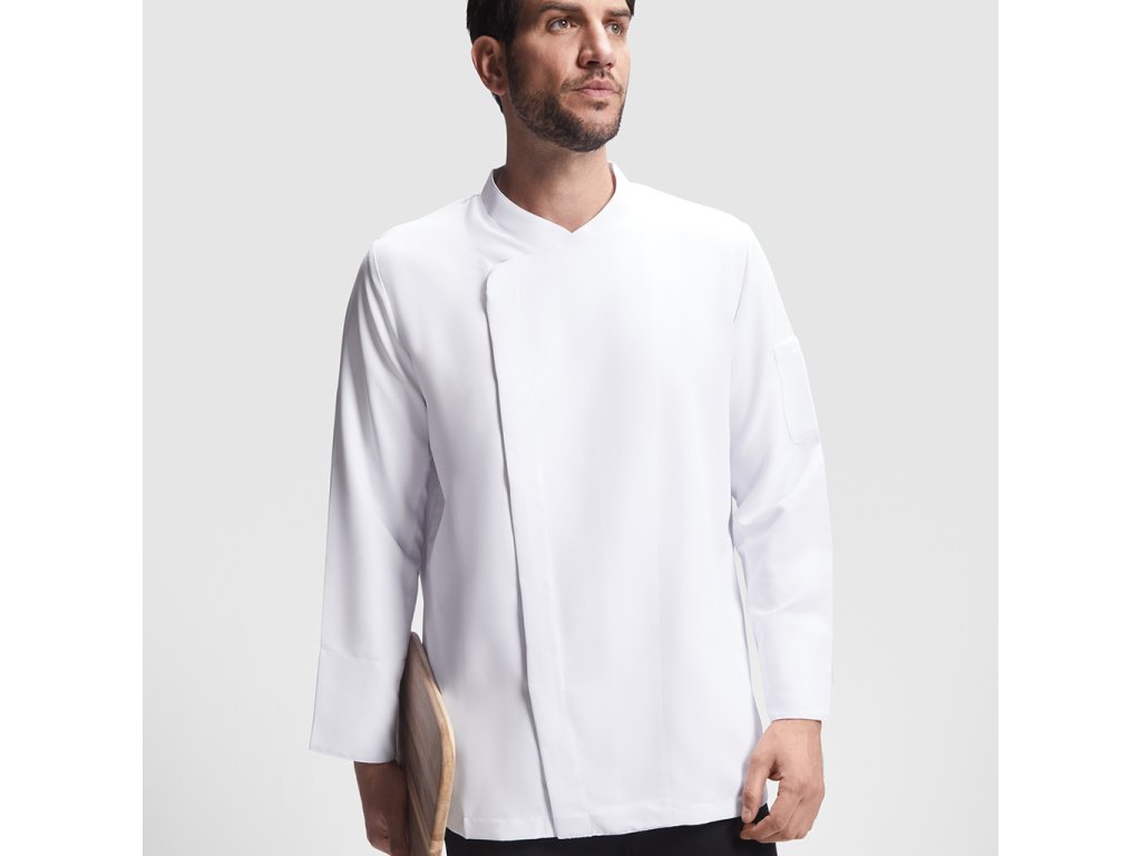 Kuchařský rondon s dlouhým rukávem, překříženým skrytým předním zapínáním na druky, mandarínovým límce a rukávy s ohrnutými manžetami. Rondon má zadní díl z prodyšné látky a pasu na levém rukávu.Doplňkové parametry