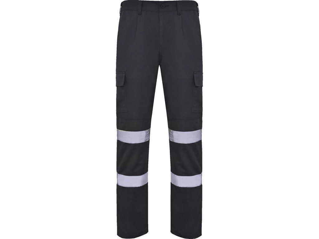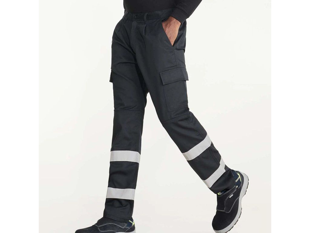 Pracovní kalhoty s vysokou viditelností z pevného materiálu. Elastický pás v zadní části. Dvě přední kapsy, funkční zadní kapsa a dvě boční kapsy s patkou a suchým zipem. Zesílený sed, dvojitý materiál na kolenou. Dva vodorovné reflexní pásy. Certifikace CE podle normy UNE-EN ISO 13688:2013/A1:2021 a EN 17353:2020. Třída B2.Doplňkové parametry