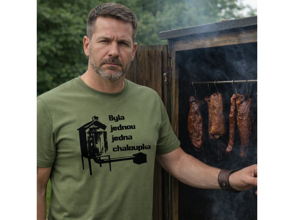 Pánské tričko s nápisem Byla jednou jedna chaloupka – udírna humorně vypráví příběh, který zná každý milovník domácího uzení. Motiv spojuje pohádkový začátek s realitou, kde hlavní roli hraje udírna, kouř a poctivé maso.