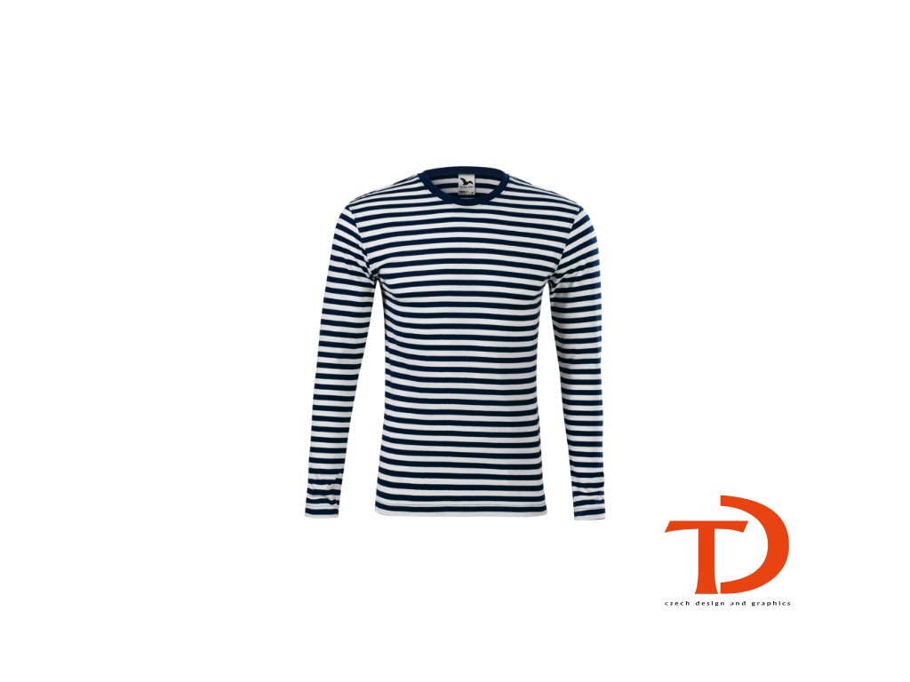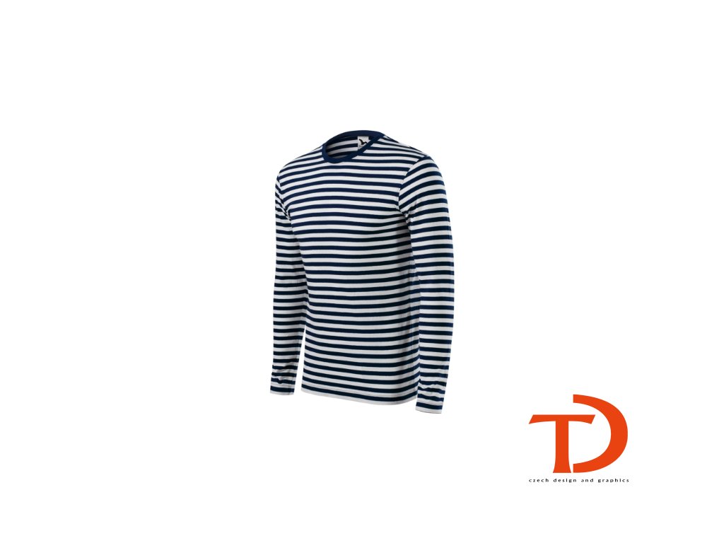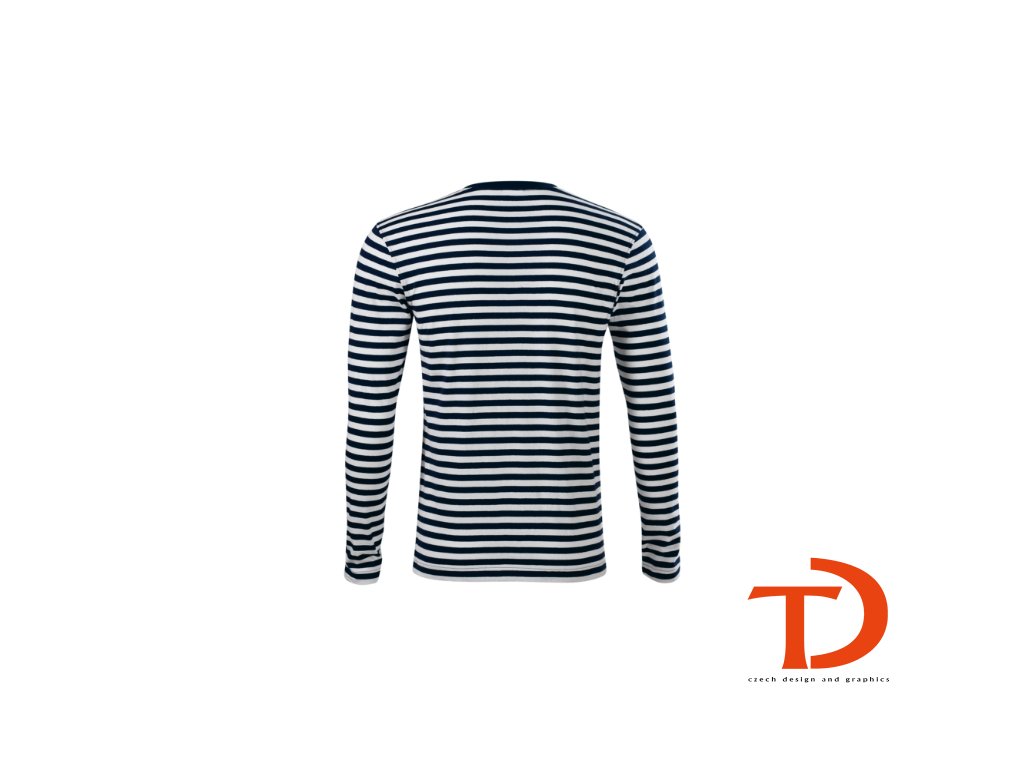 pruhy v kombinaci bílá a námořní modrá, střih s bočními švy, průkrčník lemován žebrovým úpletem 1:1 s 5 % elastanu, vnitřní část průkrčníku začištěna páskou z vrchového materiálu, zpevnění ramenních švů páskou, dlouhé rukávyDoplňkové parametry