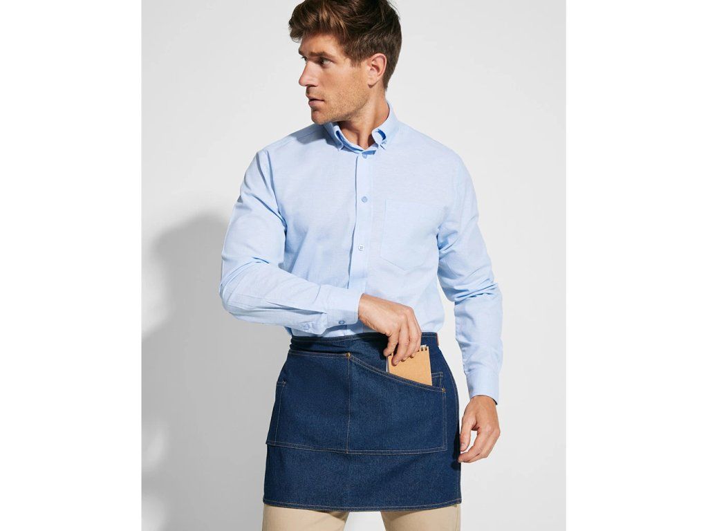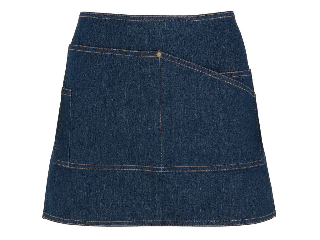 Krátká zástěra z džínoviny, která má čtyři přední kapsy s cvočky - jedna je určena speciálně pro propisovací tužku a postranní pásky na uvázání. Model je vhodný pro přípravu potravin.
